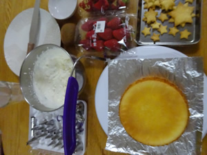 ケーキの真ん中の星は、大きいクッキーの上に中くらいのクッキーを、その上に小さなクッキーを乗せたのでクリスマスツリーのような仕上がりになっています。