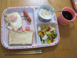 パン目玉焼き、ウインナー、サラダ、ヨーグルトが定番メニュー。