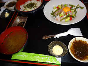 今日は魚~。海ぶどうとジーマミー豆腐(ピーナッツ豆腐)も食べました。