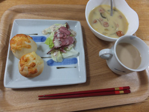 チーズコーンパンとクリームシチューを作ってもらいました。