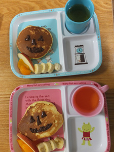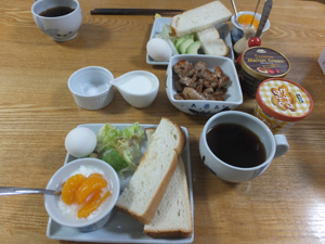 朝食です。パン・サラダ・ゆでたまご・照り焼きチキン・みかんヨーグルト・コーヒー。
