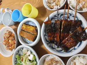 ウナギ丼、卵焼き、豚キムチ、豆腐サラダ、根菜のお吸い物というメニューでした。