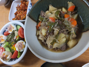 肉じゃが、ツナたまごとトマトのサラダ、豚キムチ、キノコの中華風スープとご飯です。