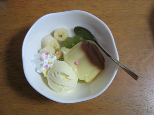 ぷっちんプリンをアイスと生クリーム、フルーツで飾った手抜きのプリンアラモード。