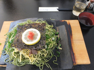 焼いた瓦の上に茶そばが盛られておりまして、つゆにつけながら食べます。