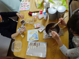 リオ&キラ、暇そうだったのでポッキーを手作り中です。