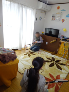 家の中で座って、スポンジボールを使った練習。